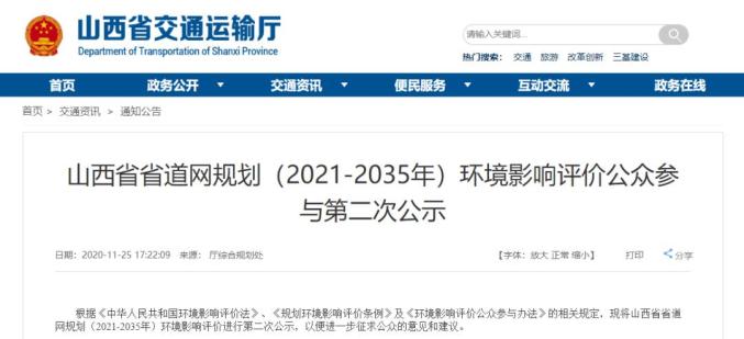 11月26日省交通运输厅消息,山西省省道网规划(2021—2035年)启动环境影响评价公众参与公示。