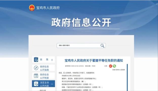因机构调整,冯旭、朱小增、张海明原宝鸡市招商局行政职务自行消失;李省堂、齐文强、王利垂原宝鸡市西部山区建设委员会行政职务自行消失。