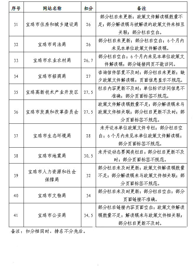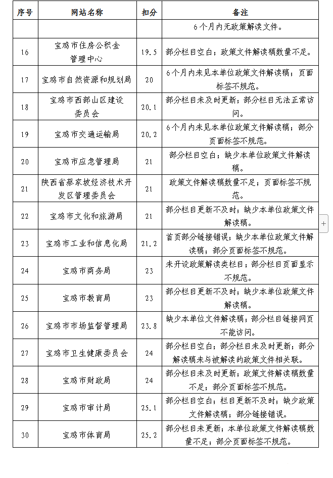 (二)一些网站政策文件解读稿数量不足。如:“宝鸡市教育局”网、“宝鸡市人力资源和社会保障局”网、“宝鸡市民政局”网、“宝鸡高新技术产业开发区”网等网站,监测时间点前6个月内未见以本单位名义印发的政策文件解读稿或解读稿数量少于3个。