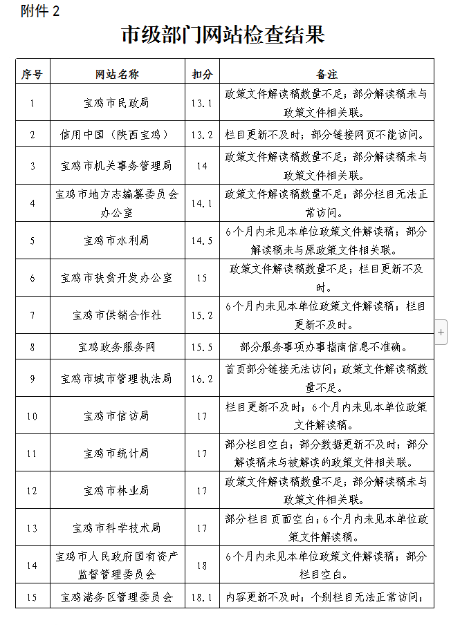 (一)一些网站部分栏目更新不及时或栏目空白。如:“金台区人民政府”网、“宝鸡市文化和旅游局”网、“宝鸡市卫生健康委员会”网、“宝鸡市地震局”网等网站部分栏目未更新;“宝鸡市生态环境局”网、“宝鸡市审计局”网等网站部分栏目空白。