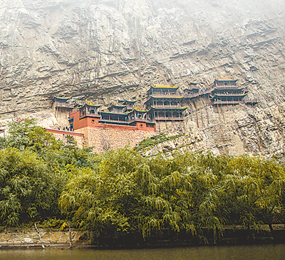前人赞叹:“飞阁丹岩上,白云几度封,蜃楼疑海上,鸟道没云中”。李白挥毫书“壮观”称奇,徐霞客则以“天下巨观”赞颂。恒山下来过了恒山水库便是悬空寺(下图,资料图片)。站在平地仰望悬在空中的建筑奇观,如袖珍的空中楼阁被安在大山立壁上,给人以上天无路之感。整个建筑只用十几根碗口粗的木柱支撑着,大有凌空欲飞之势。