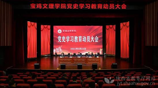 【宝鸡文理学院】3月24日下午,该院召开党史学习教育动员大会,深入学习贯彻习近平总书记在党史学习教育动员大会上的重要讲话精神,对全院党史学习教育进行全面动员部署。该院党委书记赵健作动员讲话,院长郭霄鹏主持会议。赵健指出,开展党史学习教育,对于践行党的初心使命、实现中华民族伟大复兴的中国梦,进一步坚定理想信念、在新时代坚持和发展中国特色社会主义,推进党的自我革命、永葆党的生机活力,提振全院师生精神、坚定不移实现创大更名目标等具有重大意义。赵健要求,要准确把握党史学习教育的目标要求,在学史明理、学史增信、学史崇德、学史力行上下功夫;要准确把握党史学习教育的内容和重点,着力在“六个进一步”上出成效,不断从党的百年光辉历史中汲取力量,为推动学校改革发展明确方向、凝聚共识;要扎实完成党史学习教育的关键任务,认真开展专题学习,突出强化政治引领,精心组织专题培训,积极开展“我为师生办实事”实践活动,认真开好专题组织生活会。赵健强调,开展党史学习教育是当前一项重大的政治任务,要通过党史学习教育总结经验、以史为鉴、继往开来,不断推动学院事业高质量发展。一是学党史、干实事,用实际行动回应师生期盼;二是学党史、解难事,破解发展难题,不断开创学院事业发展新局面;三是学党史、谋大事,以改革创新精神推动综合改革取得新成效;四是学党史、长本事,进一步坚定理想信念,锤炼党性修养,转变工作作风,提升工作实效,从严从细高质量完成各项工作任务。郭霄鹏要求,一要深化思想认识,提高政治站位。二要创新方式方法,勇于担当作为。三要围绕中心工作,抓好学践结合。会上,该院党委副书记栾宏宣读了《中共宝鸡文理学院委员会关于开展党史学习教育的实施方案》。