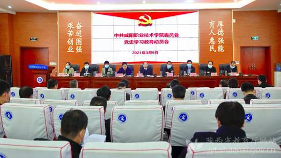 【咸阳职业技术学院】3月9日,该院召开了党史学习教育动员会,深入学习贯彻习近平总书记在党史学习教育动员大会上的重要讲话精神,安排全院党史学习教育工作。会上,该院党委副书记席尚君领学了习近平总书记在党史学习教育动员大会上的讲话,传达了党中央和省委、咸阳市委党史学习教育动员大会精神。该院党委书记刘聪博就贯彻落实党中央、省市委要求,认真抓好学院党史学习教育提出三点要求。第一,提高站位,充分认识开展党史学习教育的重大意义。一是开展党史学习教育是用习近平新时代中国特色社会主义思想武装头脑的重大举措;二是开展党史学习教育是推进党的建设伟大工程的现实要求;三是开展党史学习教育是保持党同人民群众血肉联系的内在要求。第二,突出重点,准确把握党史学习教育的目标要求。一要在学史明理上下功夫,筑牢思想理论武装;二要在学史增信上下功夫,坚定信仰信念;三要在学史崇德上下功夫,增强本领才干;四要在学史力行上下功夫,办好实事好事。第三,加强领导,切实强化党史学习教育的责任落实。一要精心组织,全员参与;二要创新方法,确保实效;三要强化宣传,浓厚氛围;四要全面贯彻,抓好落实。刘聪博强调,全院广大党员干部要以开展党史学习教育为动力,做到学史明理、学史增信、学史崇德、学史力行,扎实推动学党史、悟思想、办实事、开新局,切实做好学院各项工作,认真对照“双高”建设任务,同心同力,攻坚克难,以优异的成绩迎接建党一百周年。