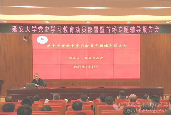 【延安大学】 3月24日下午,该校在新校区行政楼一楼报告厅举行党史学习教育动员部署暨首场专题辅导报告会,该校党委书记张金锁出席会议并作动员部署讲话,在校校领导、全校处级干部、各二级党委组织员参加了会议。会议由校长高子伟主持。张金锁在动员讲话中要求,要深入学习领会习近平总书记重要讲话精神,切实把思想和行动统一到中央决策部署、省委部署要求及省委教育工委工作要求上来,从讲政治的高度抓好党史学习教育,把着力点聚焦到深入贯彻落实习近平总书记对延安大学重要批示精神上来,聚焦到用延安精神铸魂育人上来,聚焦到推动高质量发展上来,以学习教育的新成果凝聚起延大人奋进“十四五”的强大力量,奋力谱写延安大学新时代追赶超越新篇章。要准确把握党史学习教育的目标要求、内容和重点,扎实落实好专题学习、政治引领、专题培训、“我为群众办实事”实践活动、专题组织生活会等关键任务,做到学史明理,学史增信,学史崇德,学史力行,教育引导全校党员干部学党史、悟思想、办实事、开新局。要立足学校“强特色”发展阶段实际,在不折不扣贯彻落实习近平总书记重要批示精神、坚决做到“两个维护”上见成效,在坚定贯彻新发展理念、推动高质量发展上见成效,在持之以恒正风肃纪、营造良好育人环境上见成效,以新时代追赶超越、干事创业的实际成效检验党史学习教育的成果。要加强组织领导,履行好领导机构和工作机构职能职责;坚持正确导向,牢牢把握党史学习教育的政治属性,严把政治关,树立正确党史观;加强宣传引导,为学习教育开展营造良好的舆论氛围,以强有力的组织保障推动党史学习教育走深走实。张金锁最后强调,延安大学是中国共产党创办的第一所综合性大学,开展好党史学习教育,责任重大、使命光荣。要深入贯彻落实习近平总书记关于教育的重要论述和习近平总书记对学校的重要批示精神,通过党史学习教育,深刻认识习近平总书记对学校的重要批示精神是新时代延安大学建设发展的科学指引;深刻认识延安时期党办高等教育的艰辛探索和壮阔历程,延安大学在党办高等教育历史上的重要地位;深刻认识中国共产党创办的第一所综合性大学在党的领导下,坚持走红色育人之路,为民族解放、革命胜利和老区建设所作出的重要贡献,发生的巨大变化,坚定把具有光荣历史的延安大学办得更有特色、更有水平的信心和决心。动员部署会后,陕西省委党校教授毕远佞作了题为《中国共产党的百年辉煌与宝贵经验》的首场专题辅导报告。报告从“中国共产党百年的奋斗历程”“党百年探索实践的基本经验”“学习党的历史,牢记初心使命”三个方面,回顾了中国共产党领导全国各族人民追求民族独立、人民解放、国家富强的光辉历程和实践经验,阐释了中国共产党的初心和使命。高子伟在主持时强调,本次会议为延安大学开展党史学习教育提供了工作指导,要认真学习领会,抓好贯彻落实。一是在强化组织领导上下功夫,要提高思想站位,制定好工作方案、明确任务要求,夯实领导责任,把党史学习教育抓紧、抓实、抓到位;二是在创新方式方法上下功夫,要传承红色基因,发挥好延安精神教育比较优势,增强党史学习教育的针对性和实效性;三是在抓实督促指导上下功夫,确保党史学习教育不走样、有实效。四是在统筹兼顾促发展上下功夫,要把党史学习教育与贯彻落实习近平总书记对延安大学重要批示精神、与庆祝建党100周年、与编制实施学校“十四五”事业发展规划,与推动年度重点工作任务落实相结合,推动学校高质量发展。