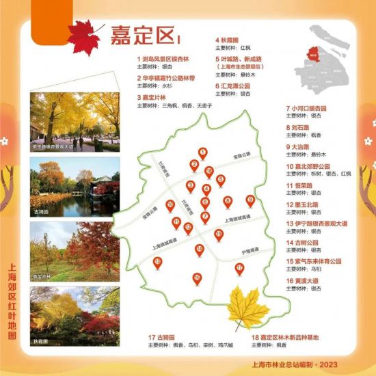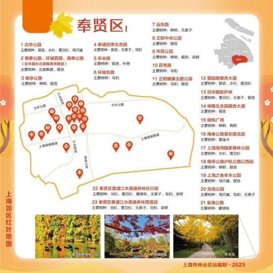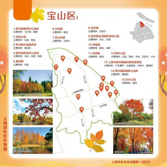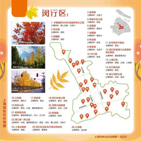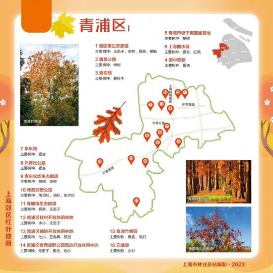 又是一年秋冬时,不知不觉中,申城换上了斑斓彩衣。银杏、水杉、枫香、悬铃木……上海市绿化市容局给大家带来了今年的郊区红叶地图,包含青浦、崇明、松江等8个郊区的林地、公园、苗圃等多种类型观赏点。一起来看看吧↓