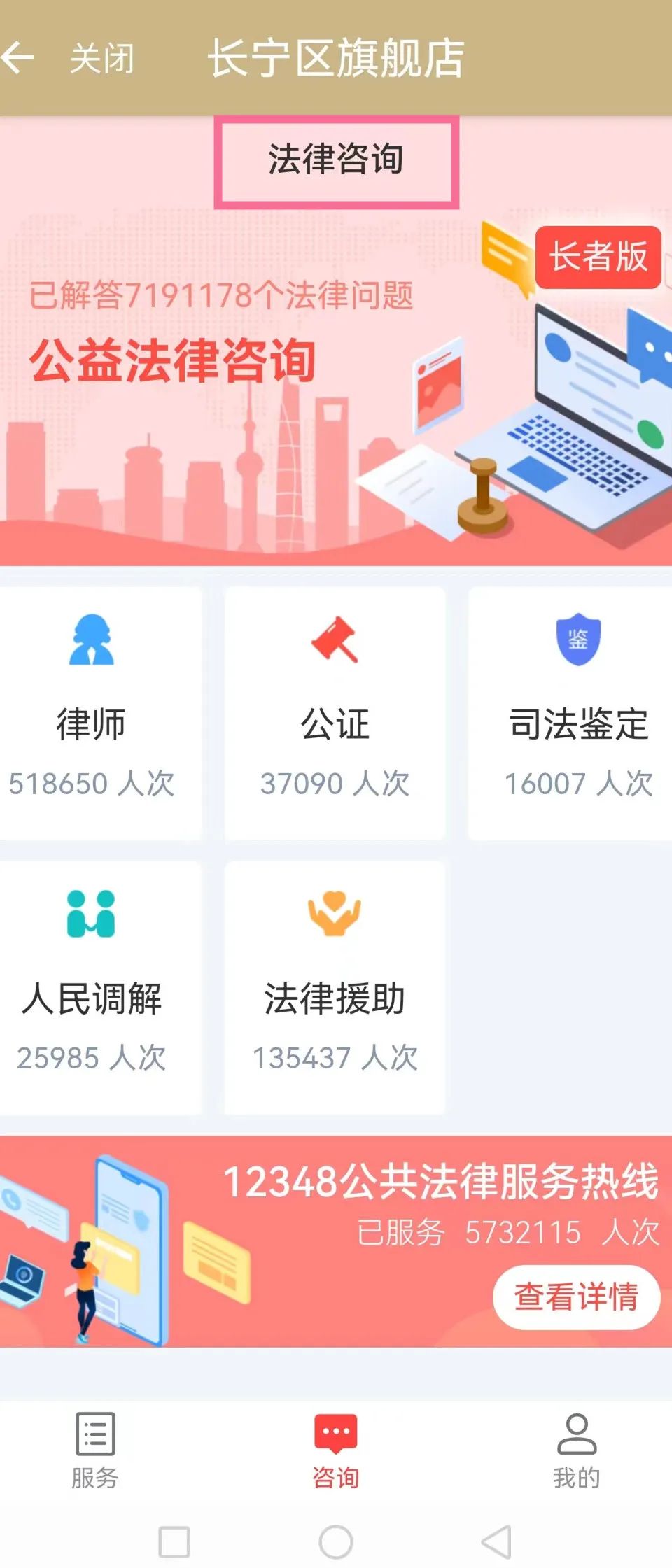 如若点击“在线法律咨询”,这是一个公益法律咨询的平台,链接了律师、公证、司法鉴定、人民调解、法律援助等公益法律服务。