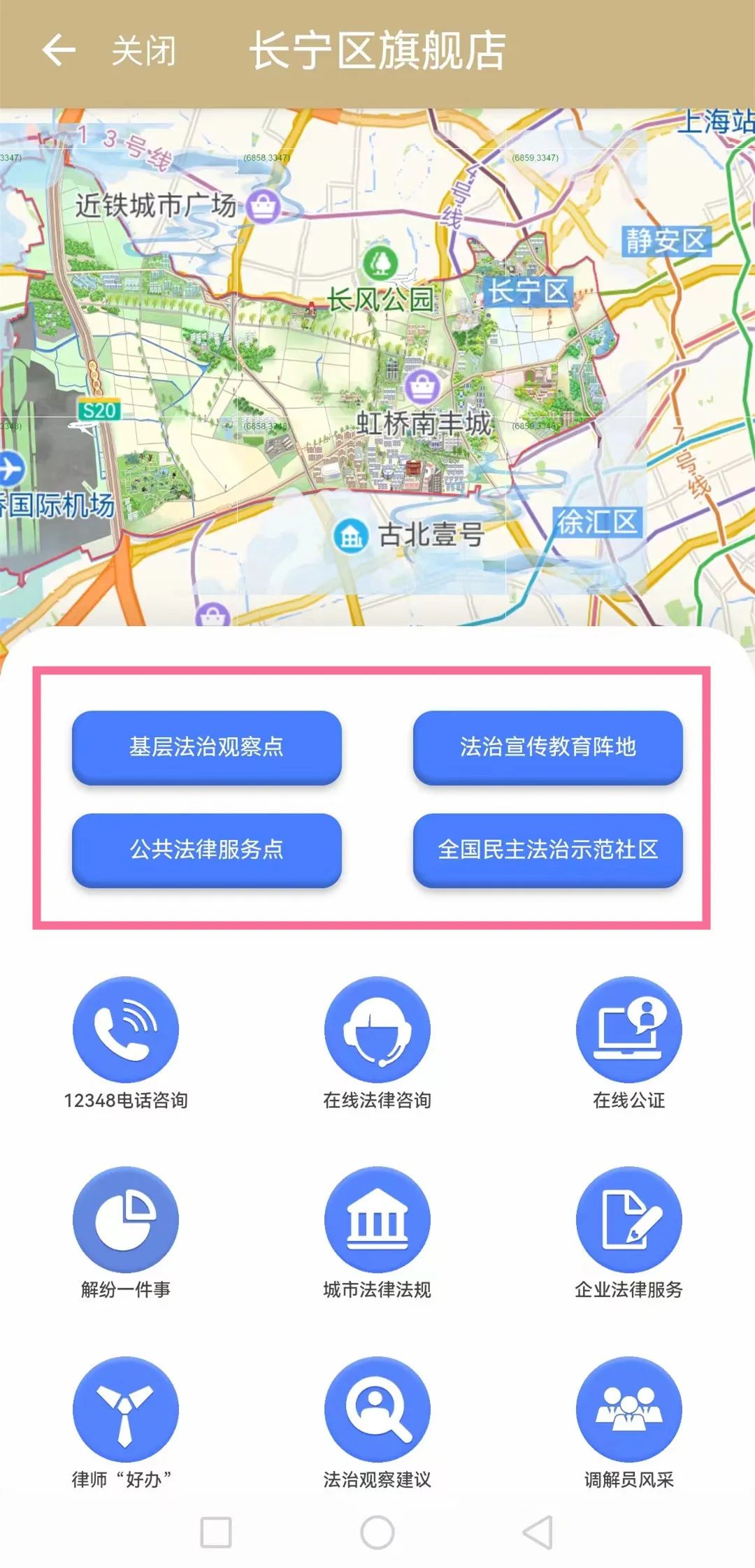 全新的“长宁区数字法治地图”图标十分醒目,点击进入,长宁区位地图和功能模块便看得一清二楚。