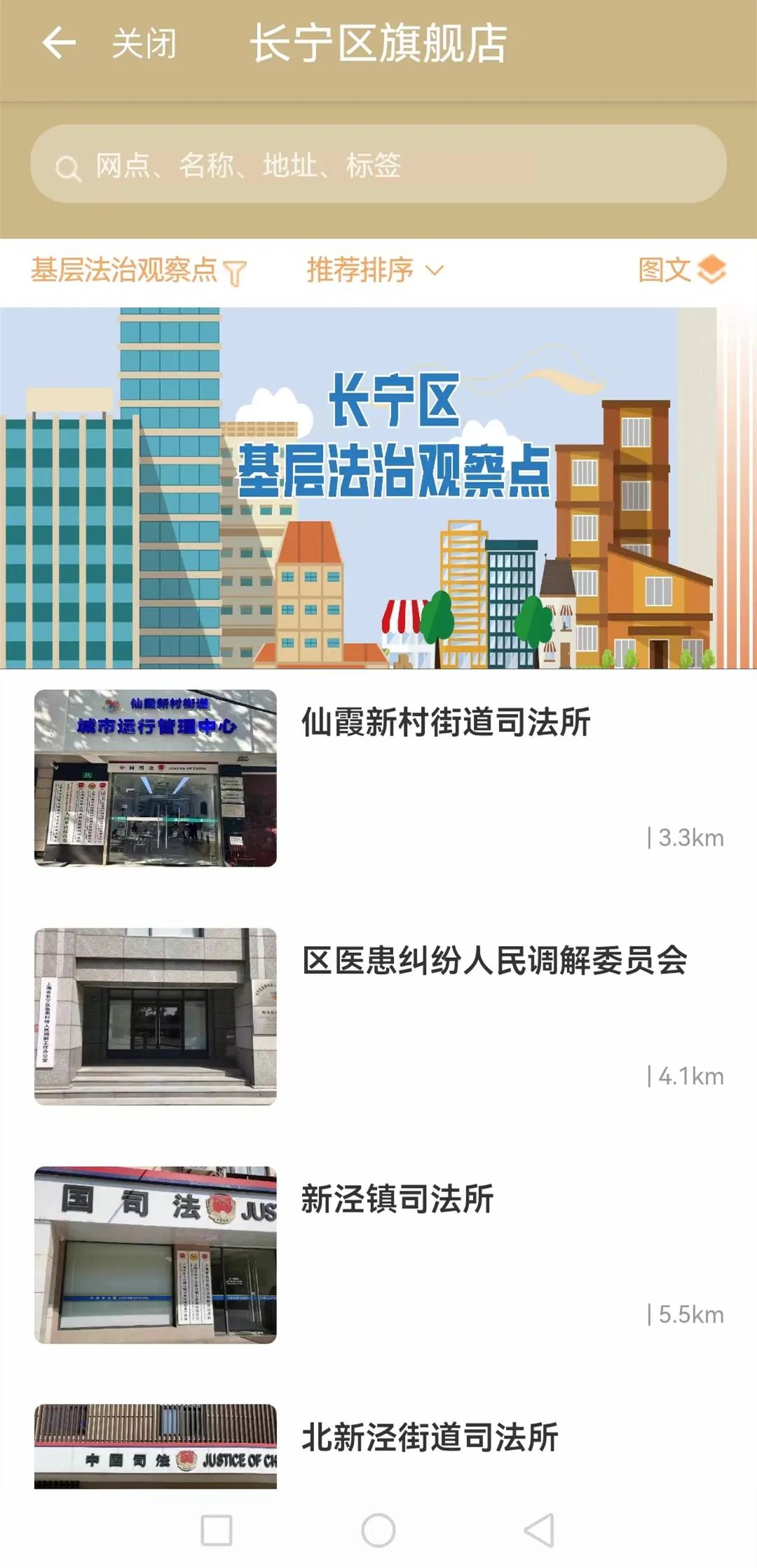 点击进入,如“基层法治观察点”板块,就能看到30个地标,这些位置排序是根据定位信息,按照距离优先等智能化分析展示。界面上方设有搜索栏,可对网点、名称、地址、标签进行检索。搜索栏下方还设有地图菜单导航模式,可直接选择不同类型的服务点,还可通过推荐排序、距离排序等形式进行排序方式的选择。