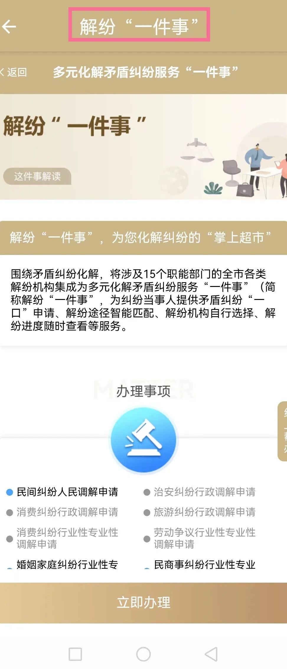 如若点击“解纷一件事”,这是一个纠纷化解的“掌上超市”,围绕矛盾纠纷化解,将涉及15个职能部门的全市各类解纷机构集成为多元化解矛盾纠纷服务“一件事”。