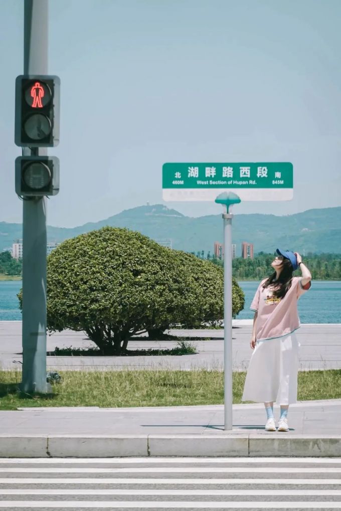 如果以湖为背景,用阳光当滤镜,站在热门打卡点位的路牌下,真的随手一拍就很出片。