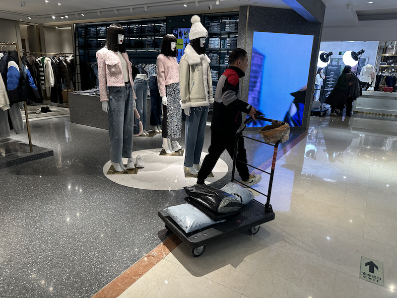 夜间的银泰百货店内,当工作人员在直播时,还有专门的物流配送人员会进行及时拉货配送,直接将客户下单的货品进行快速处理。所以当夜幕降临,这些实体店的店员和配送人员反而迎来了一天中工作最为忙碌的时刻。