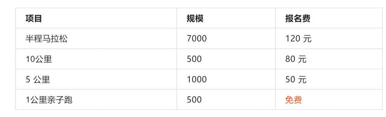 半程马拉松120元人民币/人,10公里80元人民币/人,5公里50元人民币/人,1公里亲子跑-免费(须报1名大人,1名儿童)报满为止。