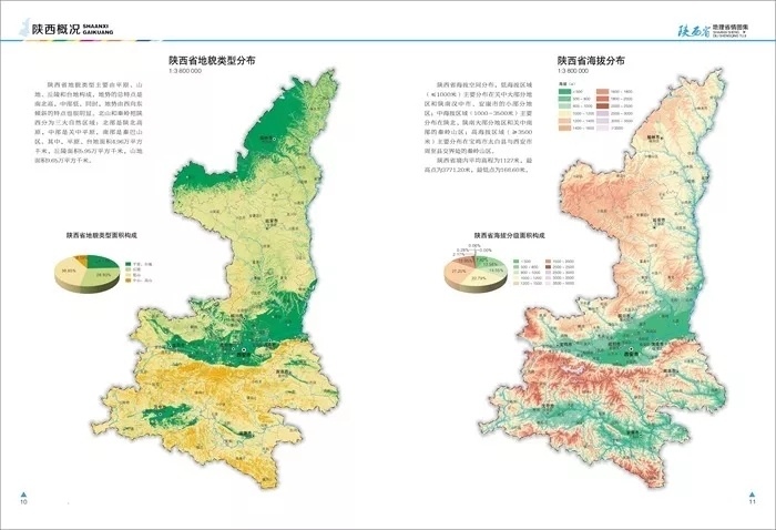 《陕西省地理省情图集》(以下简称《图集》)为大16开本,由陕西概况、地理省情、地理市情、省情监测应用、重要区域展望及附录组成。用180幅地图、118个统计图表、62张照片和说明文字组成,多层次、多视角直观地表达了陕西省地理国情要素的地理特征和分布规律。