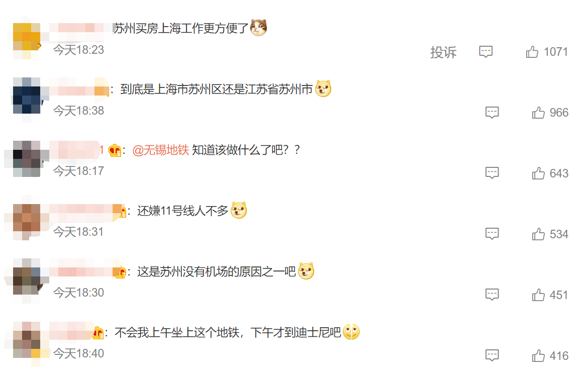 网友对此热议纷纷。有网友表示:“苏州买房上海工作更方便了”,还有网友调侃:“到底是上海市苏州区还是江苏省苏州市”、“这是苏州没有机场的原因之一吧”......