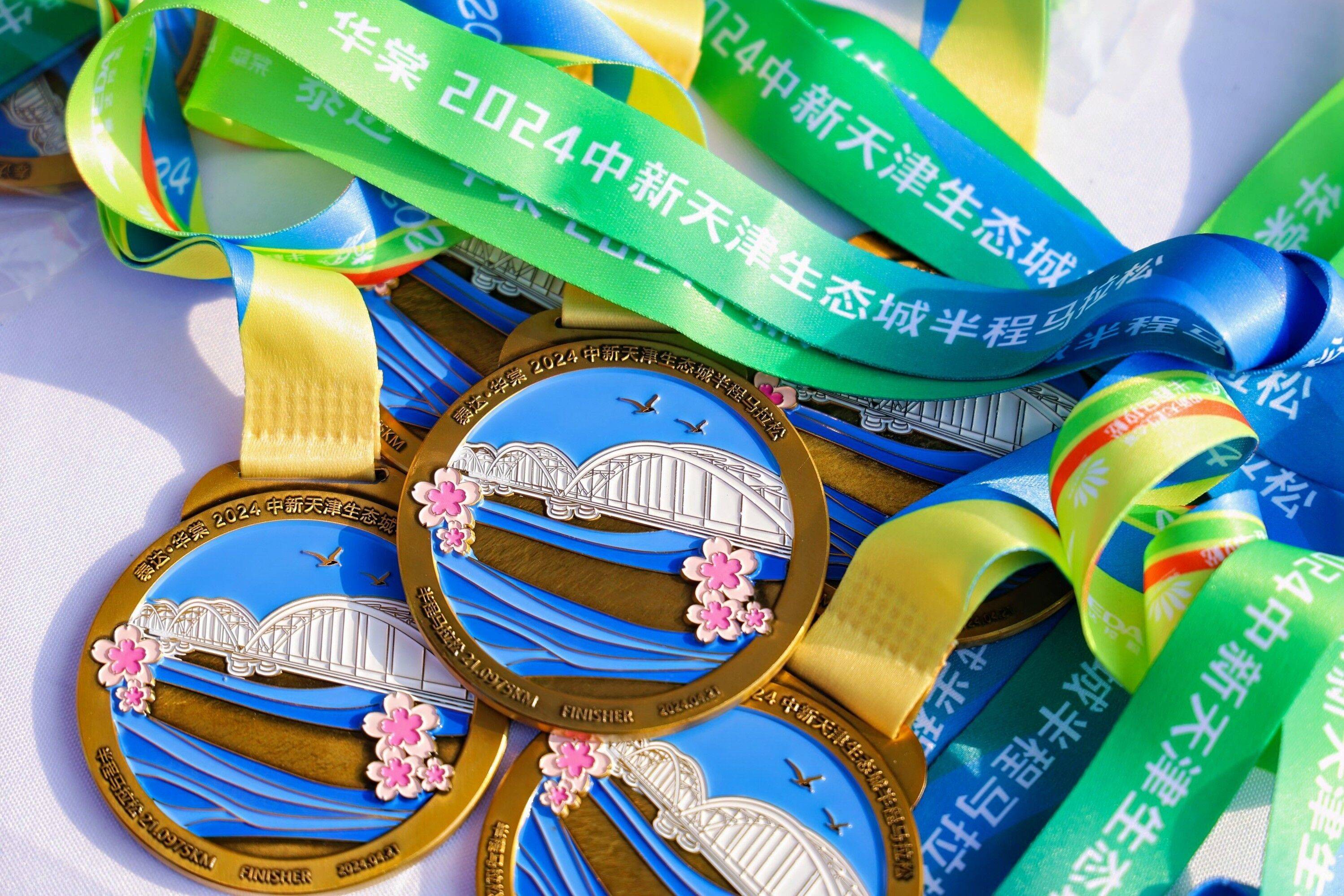赛事奖牌的设计同样令人赞叹,奖牌正面如同一幅生动的中新生态城美景画卷,以中新生态城的地标建筑“彩虹桥”为主要元素,巧妙地将樱花、大海和彩虹桥融为一体,浓缩方寸之间,不仅展现了一幅和谐美好的生态画卷,更象征着中新生态城连接世界的跨越与演变,简洁的线条、现代的造型,不仅彰显了中新天津生态城作为生态、科技和智慧之城的活力与魅力。同时,蓝色的大海和粉色的樱花也呈现了生态城独特的自然景观和魅力,给跑者“跨越大海  见证美景”的完赛心意,呼应了赛事“智享生活 幸福领跑”的主题。