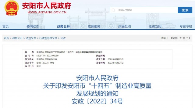 10月24日,河南省安阳市人民政府印发《安阳市“十四五”制造业高质量发展规划》。