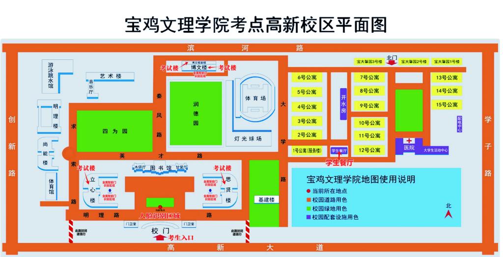 考试地点设在宝鸡文理学院高新校区,地址:陕西省宝鸡市高新大道1号。考场分布在立心楼、思贤楼、博文楼、博文楼副楼,具体如图: