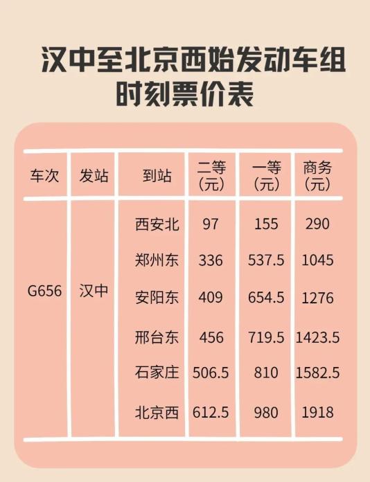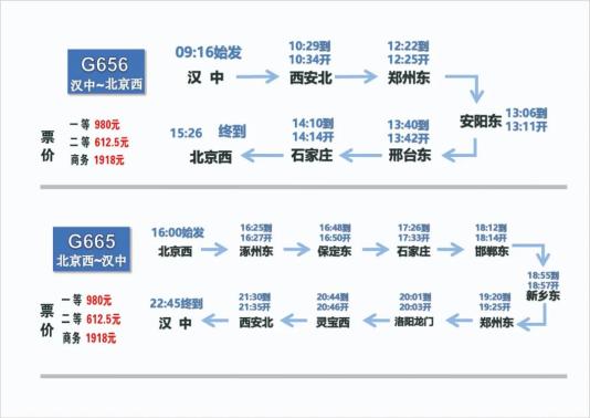 1. 汉中至北京西G656次,经停汉中(09:16始发)、西安北(10:29到、10:34开)、郑州东(12:22到、12:25开)安阳东(13:06到、13:11开)、邢台东(13:40到、13:42开)、石家庄(14:10到、14:14开)、北京西(15:26终到),全程运行6小时10分钟。