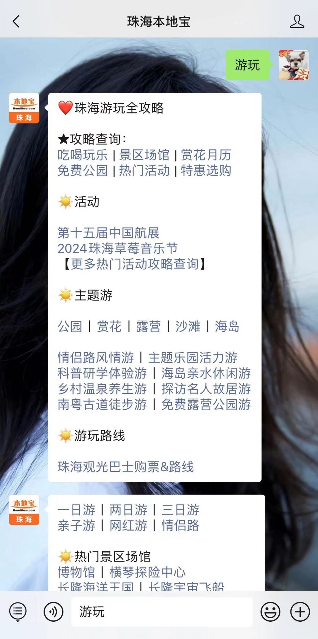 温馨提示:微信搜索公众号【珠海本地宝】,关注后在对话框回复【游玩】可获2024珠海吃喝玩乐全攻略,景区场馆/热门活动/特惠选购攻略查询入口,公园/赏花/沙滩/露营等主题游,购票入口/游玩攻略等。
