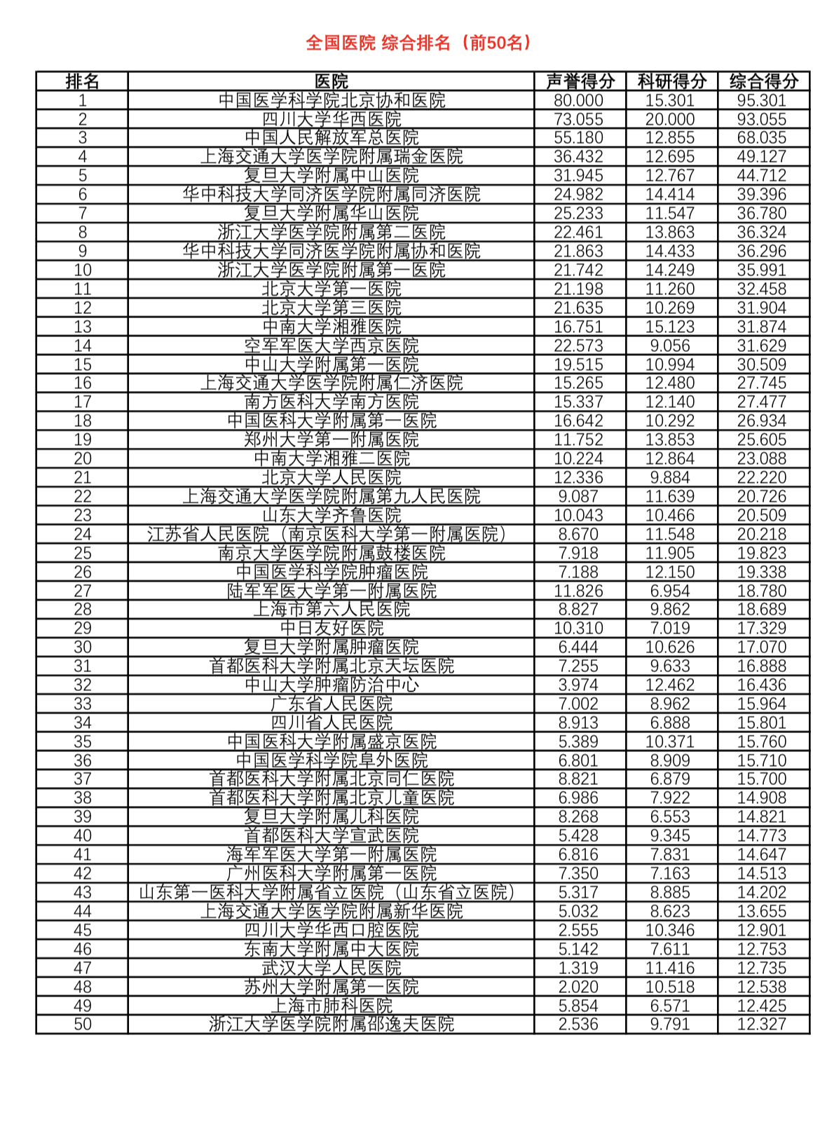 全国共有100家医院进入“复旦版中国医院综合排行榜”。其中,中国医学科学院北京协和医院、四川大学华西医院、中国人民解放军总医院、上海交通大学医学院附属瑞金医院和复旦大学附属中山医院、华中科技大学同济医学院附属同济医院、复旦大学附属华山医院、浙江大学医学院附属第二医院、华中科技大学同济医学院附属协和医院和浙江大学医学院附属第一医院,位列前十名。