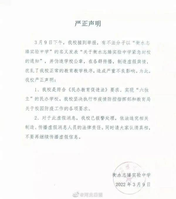 网传衡水志臻实验中学紧急封校系谣言,衡水志臻实验中学发布严正声明↓↓↓
